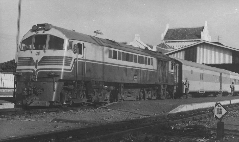 Express Surabaya – Jakarta with C-2-C type diesel-electric CC200 class no. 26, built by General Electric in 1953, at Cirebon in 1972 (William Pearce)