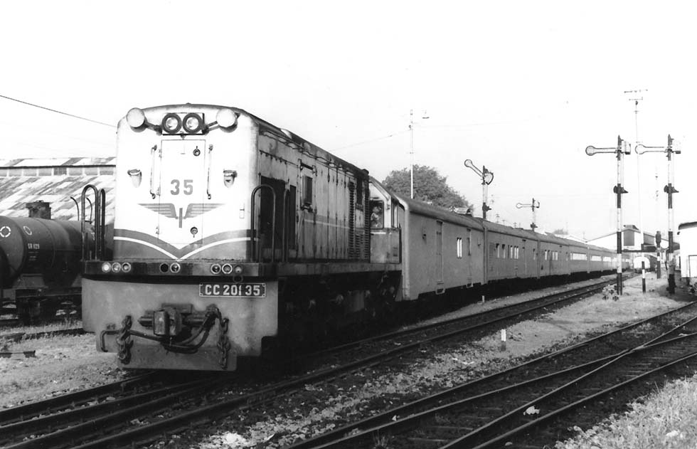 BIMA all-sleeper express Jakarta – Surabaya with CC201 35 and 9 blue cars, at Madiun 1980 (Guenter Haslbeck)