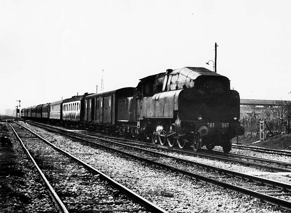 Simplon-Orient-Express, FS Franco-Crosti type locomotive 683.965, near San Giorgio di Nogaro, Oct. 1957 (Wolfgang Messerschmidt)