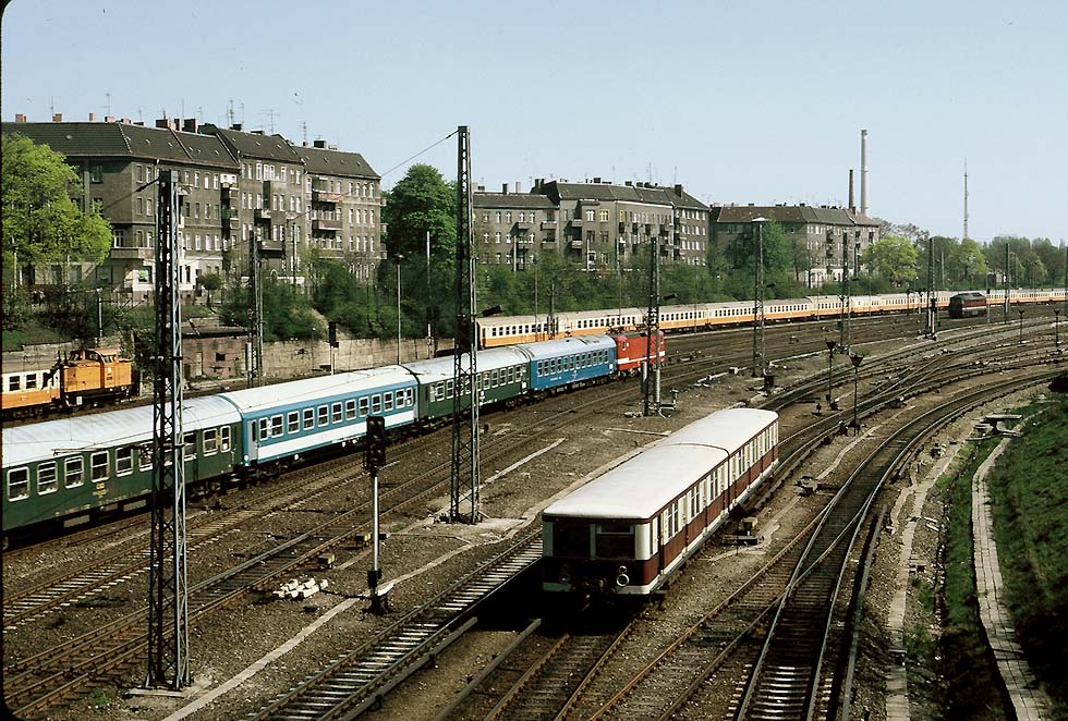 Pannonia-Express Berlin - Bucharest - Sofia, DR class 243, Czech, Hungarian and German cars, departure Berlin Lichtenberg, May 1986 (WS)