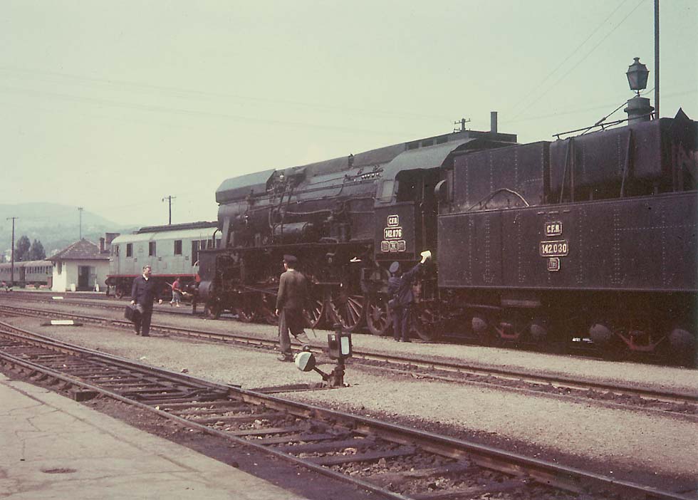 Express 201 Bucharest - Budapest, successor of the Arlberg-Orient-Express, with the Romanian 2-8-4 type 142.076 after arrival at Brasov (the old "Staatsbahnhof" Kronstadt), where the Henschel-Sulzer prewar twin diesel (in the background) took over, a rare photo from 1961 (Arnold Muell)