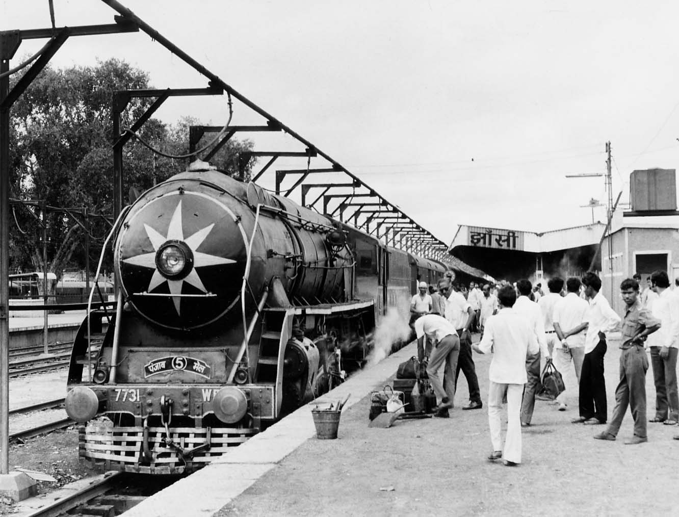 Um 11 Uhr 30 laeuft die Punjab Mail in Jhansi ein - langsamer werdend, ueber Weichen und Gleisgewirr, vorbei an einem Betriebswerk mit Dampflokomotiven, deren Kessel in der Mittagssonne glaenzen, durch den gelblichen Rauch einer wartenden Maschine hindurch bis an den hohen Perron unter dem schattigen Blechdach fahrend. Der Zug haelt an. Rotbekleidete Gepaecktraeger stuerzen sich auf die Waggontueren, Schuhputzer und Essensverkaeufer rufen durcheinander, es riecht nach allerlei Currysauce, auf einer Bank hat ein Barbier seinen Kunden schaeumend eingeseift, Maenner hocken am Boden, viele Kasten, viele Typen, manche mit Turban, manche mit Vollbart, manche mit einem Strich auf der Stirn, Frauen schweben vorueber wie Prinzessinnen aus dem Maerchen, dazu reiche Leute aus der Air-Conditioned-Klasse, ganz in Weiß, Kinder in Lumpen, Speisewagenkellner, Soldaten. Am vorderen Ende des Bahnsteigs, auf dem schwarzen Schlackenboden, wird etwas ueber einem Feuerchen gebraten. Dahinter bewegen sich glitzernd in der Sonne die Treib- und Kuppelstangen, die Raeder mit den blanken Radreifen, die oeltriefenden hin- und hergleitenden Teile des Antriebs einer stetig naeher kommenden Schnellzugmaschine, einer schwarzen Lokomotive mit stromlinienfoermig verkleideter Rauchkammer nach amerikanischer Art, mit einer silbernen Linie in Umlaufhoehe, einem darunter in leuchtendem Hellgruen bemalten Fuehrerstand und Tender, dem hoch aufgetuermten Kohlenberg, kleinen, blau gestrichenen und wie ein Hahnenkamm ausgeschnittenen Windleitblechen unter den braunschwarzen Qualmwolken und mit einem großen silbernen Stern auf der Stirnseite - die Pacific der Klasse WP mit der Nummer 7731 der Central Railway, gebaut in Chittaranjan und beheimatet in Jhansi, die planmaeßig einen der traditionsreichsten indischen Mail Trains nach Delhi ziehen wird.