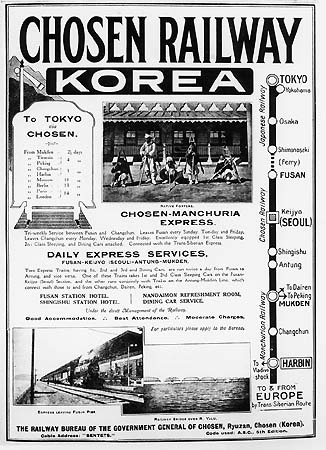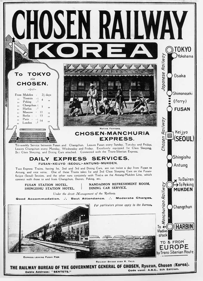 Building the huge Yalu bridge, Japan established the link with Korea. In 1912 the Japanese introduced a luxurious express Changchun - Busan (Fusan) in occupied Korea, with ferry connection to Shimonoseki and from there the Shimonoseki-Shimbashi Special to Tokyo. An advertisement of December 1913 described that Chosen-Manchuria Express as a tri-weekly service between Fusan Pier (Busan) and Changchun, "excellently equipped" with 1st class and 2nd class sleeping cars and a diner. The railway administrations mentioned were the Chosen Railway and the Manchurian Railway. A report by H. Caren, published by Railway Magazine, described the acquisition of steam locomotives and Pullman cars in America, regardless the cost, and the train consisting of long carriages finished in dark green and gold, hauled by a Pacific engine. Even when traffic from Europe was stopped by World War I, the exclusive express continued running, in 1916 reduced to a once-weekly service, and only after December 31, 1916 it was withdrawn. The report by H. Caren continued with the personal experience of a travel from Pyongyang back to Japan in that year: "Just before 3 p.m., and sharp on time, the train rolled smoothly into the platform and came to a dignified stop. As I had been led to anticipate, everything was perfectly spick and span, from the great locomotive through the line of five absolutely uniform carriages in their green and gold finish, and the many smartly uniformed attendants. As there were some minutes to spare, I walked the length of the train along the platform and it was only then I realized that I was the only passenger. The time of departure approached and the station-master stepped out of his office, came up to me and saluted, and asked if I would kindly entrain. He was followed by the Chef-de-Train, who also saluted and escorted me to the door of my sleeping car. A boy then led me down a softly-carpeted corridor and ushered me into a beautifully-furnished compartment, which he informed me was my sitting-room, and indicated that the adjoining one was my bedroom; then he bowed low and left me... Tea appeared to be indicated so I strolled along more carpeted corridors until I reached the dining car, which I found to be a flawless symphony of ivory white ceiling, large plate-glass windows, beautiful paneling, and perfect table appointments. Here I had a choice of 24 seats, with four waiters to serve me...".