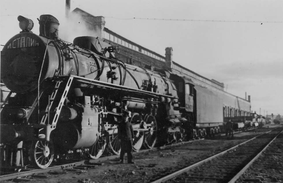 When in October 1941 German troops attacked Moscow, hundreds of trains left the capital for Siberia. Locomotives from the West appeared there, including the Polish Pt31 (2-8-2), the FD (converted to 2-10-4), and as a locomotive driver, who emigrated to Israel, later confirmed, also "Josef Stalin" express passenger engines. About a travel in January 1945 from Moscow to Karaganda, Johan H. Wigmans ("Einer von Millionen") reported: "The train could run also in Western Europe, if there were not the compartments adaptable for sleeping, three berths one above the other … At Gorki we are waiting three days for the next train to the Ural … sometimes the police controls the passengers, but the stowaways on the roofs are not troubled… Also our train conveys a Stalinski…". That's a box car with prisoners. When U.S. Admiral Leslie C. Stevens in 1948 managed to pass the armed guards at Moscow Yaroslav station, he saw the express for Vladivostok, its crowded cars with the plank-beds and "finally the red international car, which is placed in the middle of every important train" - probably the wooden ex-CIWL sleeper. From 1948 the typical new cars, profile 0-T, the first ones built in Eastern Germany, began to replace the old 1-T cars. The ex-CIWL cars disappeared long before in 1966 the Kurier 2/1 became the express 2/1 "Rossiya".