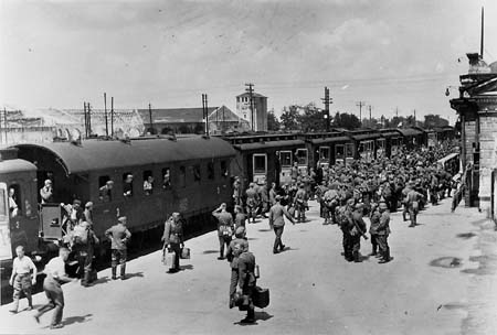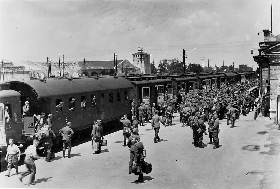 A Christmas holiday train for German soldiers during WWII with DR and formerly Prussian 3rd class cars on standard gauge at Dzankoi, Krym, running to the border station (DB Verkehrsarchiv)