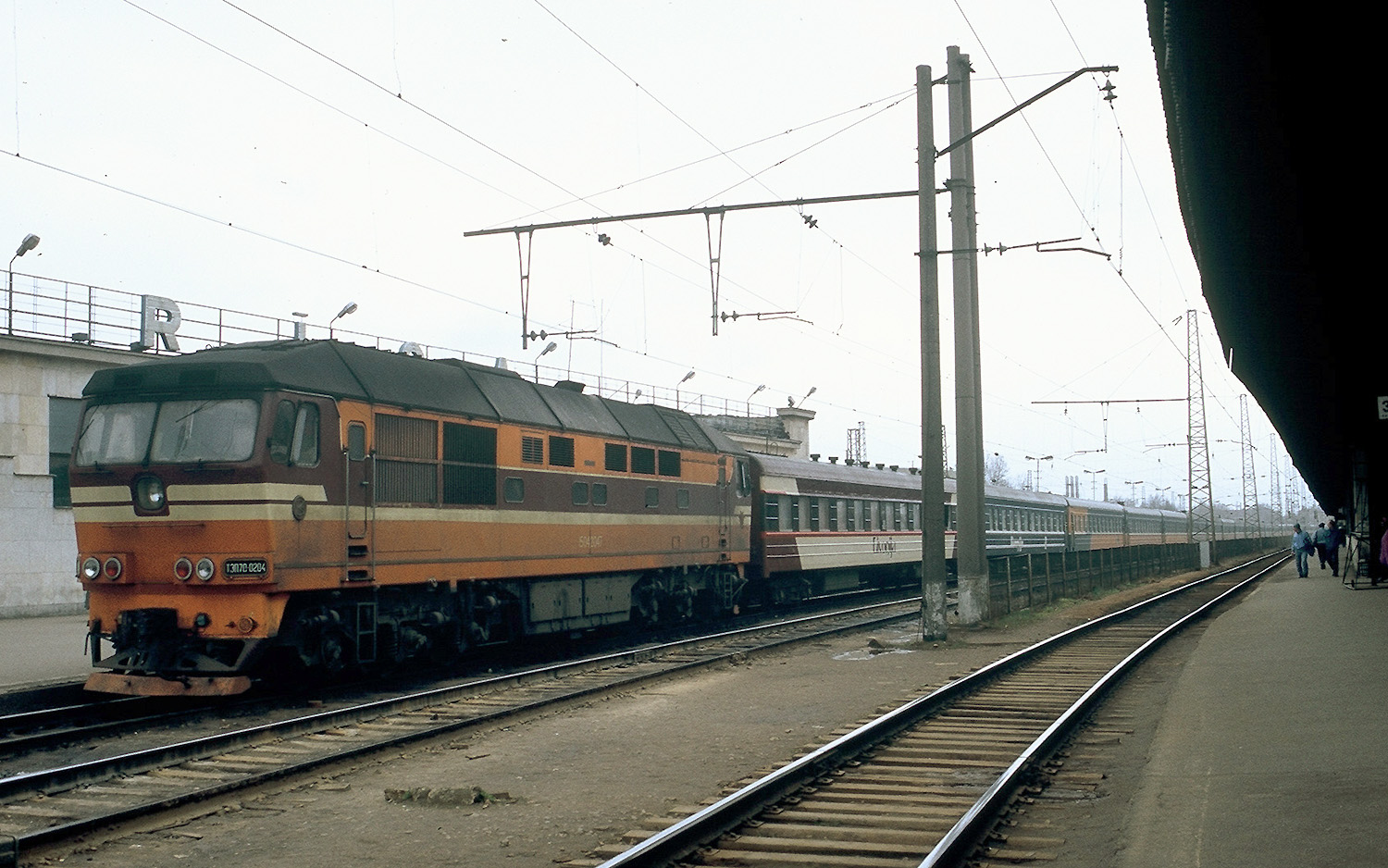 Express St. Petersburg - Berlin with a TEP60 (right), Vilnius, April 1992 (WS)