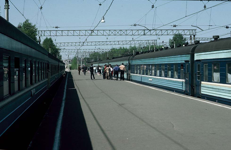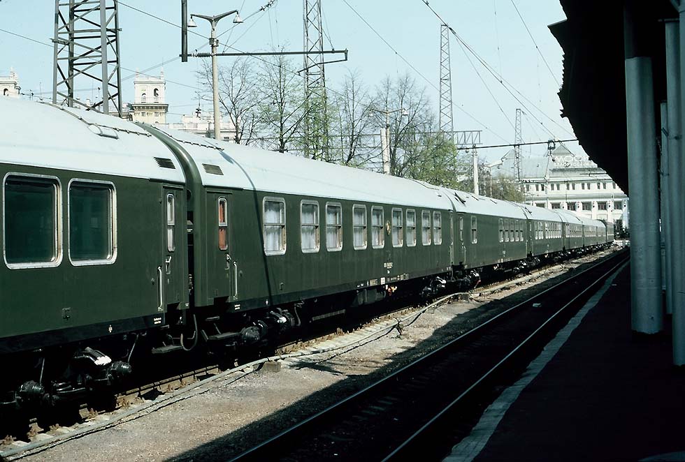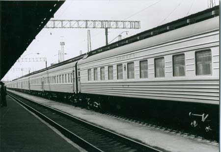 The light-blue/yellow "Yantar" Moscow - Kaliningrad, Moscow Belorusskaya 1986 (WS)