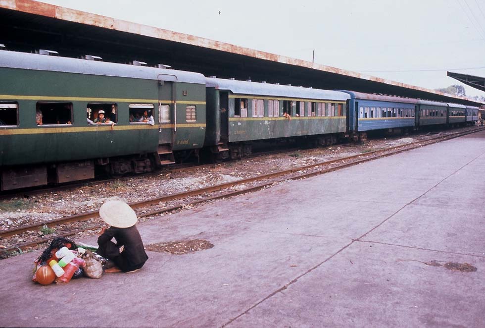 The express from Ha Noi to Sai Gon (Ho Chi Minh Ville) on meter gauge restarted in 1976 with a variety of cars, green or blue. In the meantime the service was upgraded with several new trains including sleeping accommodation and diner service, now painted red/blue. The train became known as the Reunification Express.