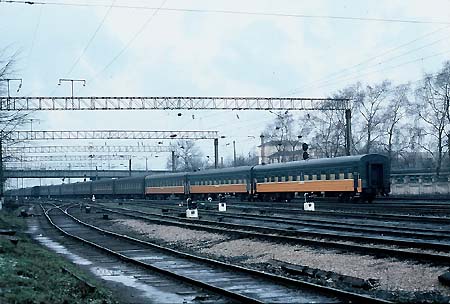 Daneben laeuft hinter einer orangefarbenen Ellok EP 05 der Chopin-Express aus Wien ein, mit einem sowjetischen und einem CIWLT-Schlafwagen, dem letzten der ehrwuerdigen Compagnie im Ostblock. Photographieren ist damals strengstens verboten, beim Heben der Kamera gibt es ein ungutes Gefuehl und - von draußen einen scharfen Ruf wie "Milicja". Nur nicht hinschauen, die Scheibengardinen schließen, Kamera verstauen; Gott, lass die naechsten Minuten gut voruebergehen...