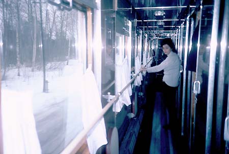 Bis wenige Tage vor Abfahrtstermin zur Reise ueber Sibirien nach Peking hatte sich die chinesische Botschaft mit dem Visum Zeit gelassen und selbst die zufaellige Urlaubsbegegnung mit Hua Guafeng's Cousin konnte nichts nutzen, ja haette eher schaden koennen, denn Hua war bekanntlich durch Deng entmachtet worden... Schließlich konnte die Fahrt doch noch mit dem chinesischen Visum im Pa , dazu dem sowjetischen, dem polnischen und dem mongolischen, am Sonntag, den 27. Maerz 1988, also noch zur "sozialistischen" Zeit, am Berliner Hauptbahnhof losgehen. Der heiße Tee, den die "Mamuschka" aus dem Samowar des sowjetischen Schlafwagens serviert, weckt an jenem kuehlen Morgen die Lebensgeister. Es ist ein bequemes Vierbettabteil in einem der hohen Wagen aus dem Werk Ammendorf, das uns die Schaffnerin zugewiesen hat. Weit vorn brummt eine russische 132 der DR, dahinter laufen DR-Wagen nach Warschau, die sechs sowjetischen Schlafwagen Berlin - Moskau und am Schluss waren ein russischer RIC-Schlafwagen Oostende - Moskau sowie ein uralter "Belgier" aus dem in Berlin auf dem Nachbargleis eingelaufenen Zug angehaengt worden. Es ist der erste Teil des Ost-West-Express, welcher nun, nach einem Stop in Karlshorst, gemaechlich der polnischen Grenze zustrebt.