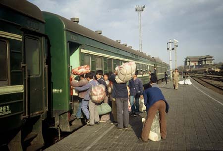 Unueberschaubare Menschenmassen draengen sich am Hauptbahnhof Beijing Zhan. Zuege mit hellblauen BJ-Diesellok und gruenen Einheitswagen, meist offene Schlafsaele, aber auch Schlaf- und Speisewagen, starten nach Norden und nach Sueden. Erst nach Ausfahrt verzweigen sich die Strecken. Ein Zug aus Wuhan an der Strecke nach Hong Kong hat zwischen seinen 18 Wagen auch einen gelb/cremefarbenen, ein anderer nach Norden besteht aus hellblau/hellgrauen Wagen. Ein Gespann der leistungsfaehigen NY7 befoerdert den Zug Beijing - Yinchouan ueber den Nankou-Pass. Der rote Fex nach Shanghai koennte ausgefallen sein wegen der Cholera-Epidemie. In einen Lokalzug steigen Menschen zum Fenster ein. Trotzdem wird gelaechelt...