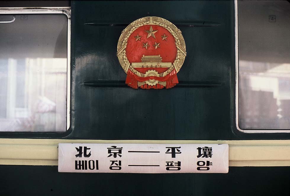 An den Express 27 nach Pyongyang heranzukommen, erwies sich als gar nicht so einfach, denn er faehrt, wie allgemein die internationalen Zuege, vom ersten Bahnsteig ab, dessen Zugang ausschließlich ueber die "International Lounge" moeglich ist. Und an deren Ausgang wacht Polizei darueber, dass niemand ohne Billet dem Zug zu nahe kommt. Es gibt aber auch Bahnsteigkarten fuer den internationalen Perron und mit Hilfe eines Amerikaners, der chinesisch spricht, gelingt es, eine zu erwerben. Da stehen nun die 15 Wagen, doch die meisten fahren nur bis Dandong an der Grenze. Lediglich ein "harter" und ein "weicher" Schlafwagen, beide mit Vierbettabteilen, tragen das rote chinesische Staatswappen und die Schilder mit den fremdartigen Schriftzeichen Beijing - Pyongyang auf Chinesisch und Koreanisch. Ab Beijing zieht eine blaue Diesellok BJ und in Dandong wird eine nordkoreanische den Express uebernehmen zur Fahrt in den verschlossensten Staat der Erde. Weiter in das "Land der Morgenstille" hinein, in die Region der Tempel, der Geister und mandelaeugiger Sagenprinzessinnen zwischen Asien und Pazifik, faehrt garnichts - am 38. Breitengrad ist Schluss.