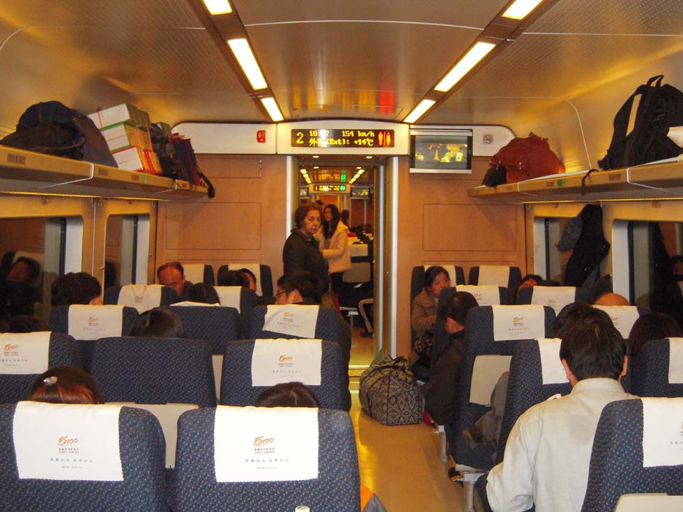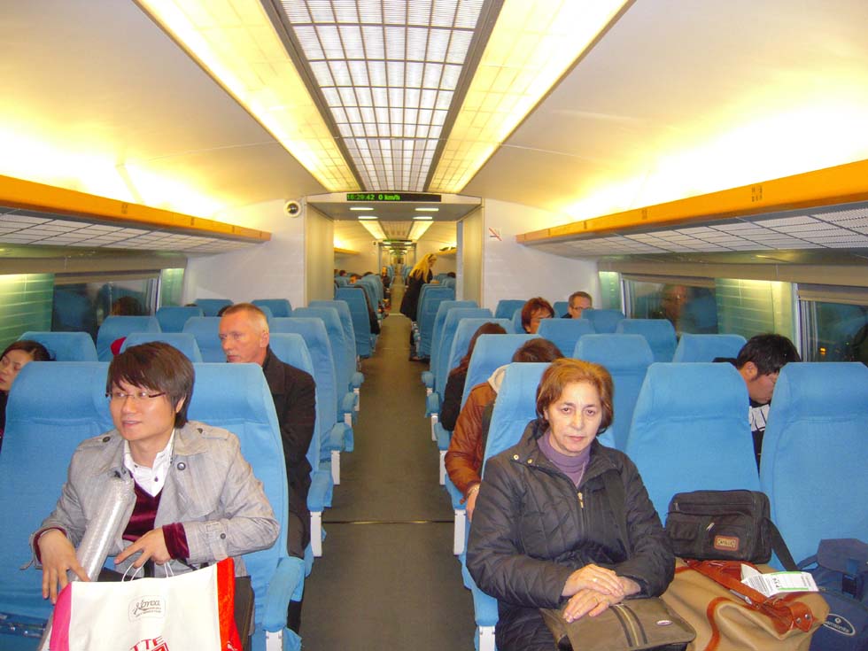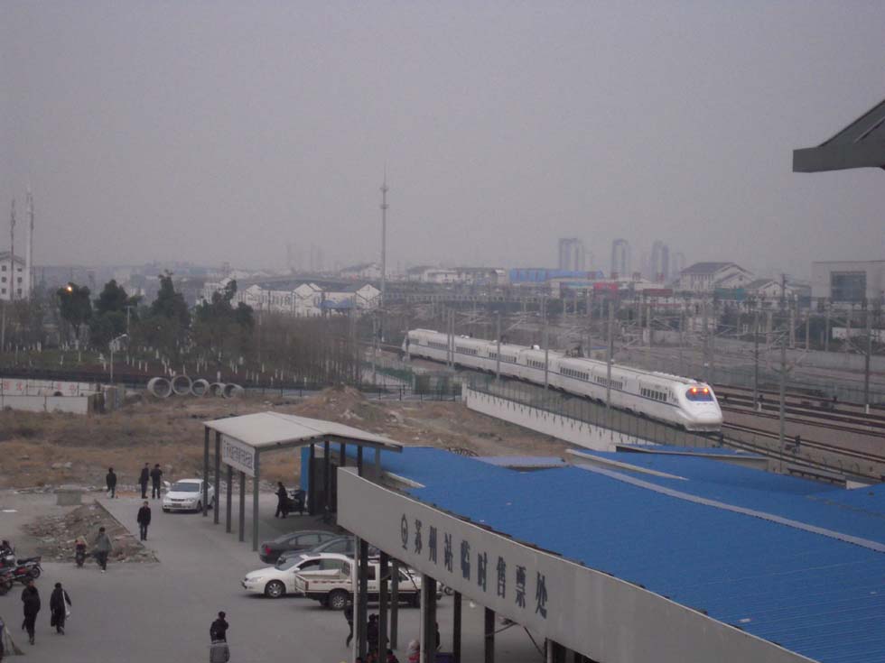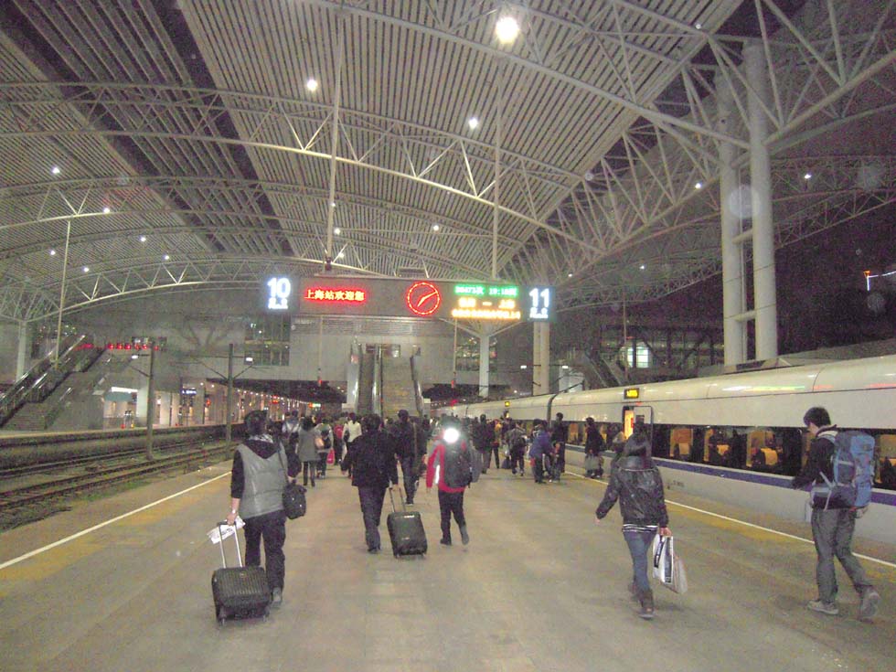 Back to the railway station, the white high-speed trains can be watched - every few minutes one is coming or going, stopping or passing the station at an immense speed. The terminal is crowded with people, everybody has to search for the waiting-area corresponding with the train number, only a quarter of an hour before departure one can pass the ticket control and search for the car number marked on the platform. Night has already fallen, when the train enters and - what a surprise - it is a high-speed train! A Chinese explains that we have a "no seat" ticket, but it doesn't matter. The train, a 16-car CRH1 type from Bombardier, truly a semi high-speed, is coming from Xuzhou, 535km distant, and takes only half an hour for reaching Shanghai. The time passes quickly, the monitor shows a speed of 207km/h, the ride is quiet and soon we arrive at Shanghai station, stopping by the side of a Japanese-type CRH2 and a CRH3 resembling the German ICE3. What an experience in a country where once, in 1876, thirteen years after the first project Shanghai - Suzhou had not yet been realized, the first railway to neighboring Wusong had been demolished by instigated demonstrators, being convinced that rail has no future and steam is too dangerous for mankind…