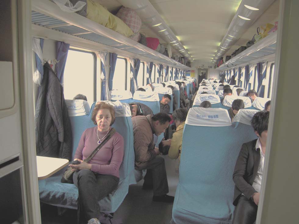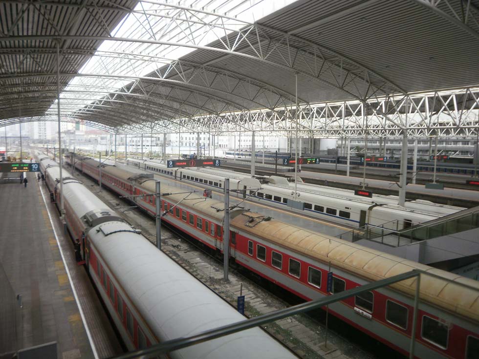 In the wide iron hall, built in the years after the end of communism, roughly a dozen trains are waiting. On "our" platform it is the express K294, bound for Qingdao (before WWI the German outpost Tsingtau), which it will reach the other morning. The long train consists of red/light-gray seating-cars, diner and sleeping-cars, hauled by a red SS9 type electric engine. Only the car correlating with the ticket number can be boarded, it is already occupied, but truly the two Pullman-type seats in accordance with our ticket are free. Another long-distance train, consisting of blue/red/light-gray seating-cars, diner and sleeping-cars and still another blue one are entering the station.