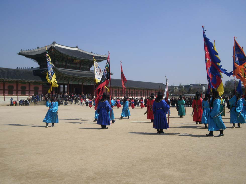 The Incheon railway station is situated near the old port and from there the electric suburban train sets of the combined Seoul Metropolitan Subway and Incheon Subway are reaching the capital in a little more than an hour, crossing the Hangang river and passing the Seoul railway station, where the TGV-type high-speed trains are a startling sight. We leave the train close to the vast area of the Gyeonbok Palace, the symbol of Korean tradition and pride since the Joseon Dynasty had started there to build up their empire, culture and Confucian teaching seven hundred years ago. And - by chance or by a miracle - our arrival is just in time to admire the spectacular parade in historic uniforms, shown by so many tourist books. It's a heavenly present… The walk leads us further to the Congye-Sa Temple, where we can join an immense crowd, praying silently. And later, when walking over the bridge on the northern side of Seoul railway station, we get another present: A plot has been cleaned, possibly for building still some more skyscrapers, and from there the trains of the standard-gauge Korean National Railroad KNR, entering and leaving the station, can be watched and photographed: First an electrically-hauled ordinary express, then a Saemaul Express diesel train set, a modern suburban electric unit (obviously it's not the A'REX of the new line to Incheon International Airport) and then, of course, the KTX high-speed trains, resembling the French TGV, but with 18+2 cars being of a higher capacity. Coming and going in intervals of 10 to 30 minutes, they connect the capital with Busan, Korea's most busy harbor in the south, covering the 409km in 2 ¾ hours.