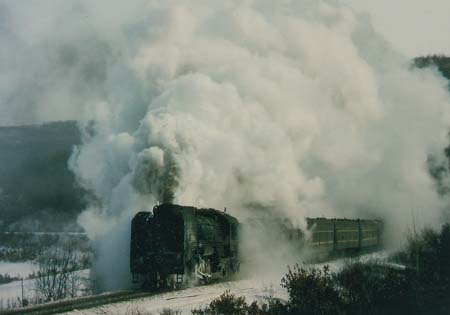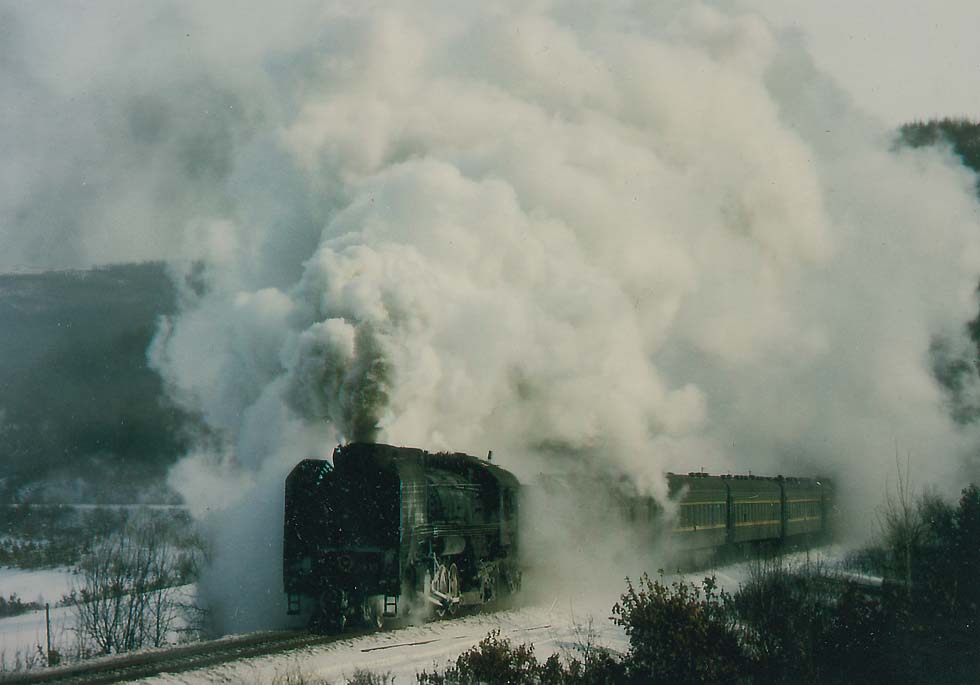 A transmanchurian train Mudanjiang - Suifenhe, Chinese class QJ, near Daguanling on an icy January morning in 1991 (Guenter Haslbeck)