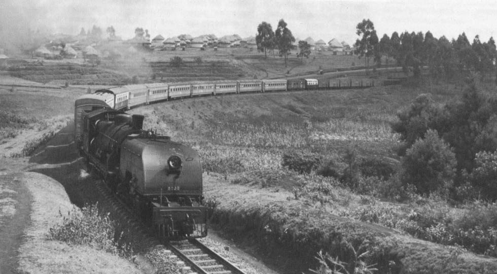East African Railways: heritage, various 4-8-2+2-8-4 (GD, 1952 ex-Burma; from 1954 class 60; from 1955 the heavier class 59), from 1960 diesel English Electric, then MLW. The biggest 4-8-4+4-8-4 Garratt, proposed by chief engineer Bulman, was not built. Colors: KUR graphited, EAR maroon/black, diesels green, Kenya Railways blue.