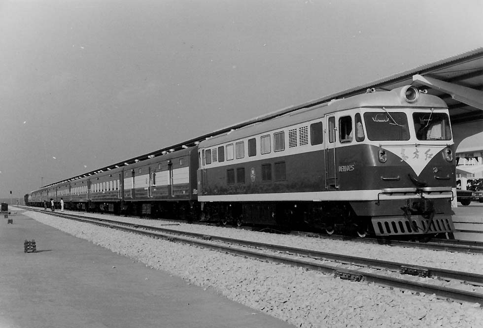 From 1976 arrived at New Kapiri Mposhi in Zambia the express from Dar es Salaam, consisting of Chinese cars 1st class with 4-berth, 2nd class with 6-berth compartments, 3rd class coach, diner and van, hauled by Chinese DFH2 diesels, painted blue/white and green/white. Later came grey Krupp diesels (GE license). Temporarily the service was interrupted.