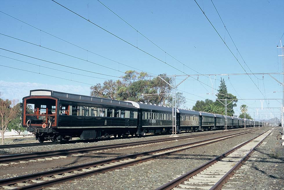 Colors: dark green/cream; locomotives by Spoornet, orange. At Pretoria, Rovos uses own steam locomotives, a class 6, three 19D and the oil-fired 25NC 3484.