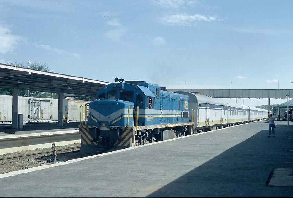 Tourist specials Blue Train and the Pride of Africa are continuing the tradition of the African de-Luxe trains of the past, unrivalled by any other train on earth. Blue Train and Pride of Africa became the only expresses which connected the Cape with the Victoria Falls. The Pride of Africa by Rohan Vos even is the only train which ever did run from South Africa to Dar es Salaam in Tanzania -- via the TAZARA railway, built by Mao's China! The first trip started at Dar es Salaam in 1993, after the train arrived empty from South Africa. On the TAZARA it was hauled by the light-blue/cream colored Krupp diesel DE1011, between Victoria Falls and Bulawayo by the Garratt 417 and near Pretoria by Rovos' green class 19D steam locomotive. In 2005 the train to the Victoria Falls had been temporarily stopped at Pietersburg, South Africa, where the passengers took Rovos' historic Convair prop plane for a flight to Zambia. From Lusaka, Zambia, steam tours to the Victoria Falls were offered. With the voyages to Dar es Salaam the Pride of Africa is now the sensation of TV reports, the most exotic train of the world. Namibia's Desert Express of 1998 is the third de-Luxe special in the southern part of Africa and the only one in a modern "African" style, built in Namibia and created by international designers, mainly Anja Krenz and Karl-Dieter Bodack of German railways as consultant. The General Electric engine 50B was specially refurbished for this train. In 2006 Alby Glatt's agency Pullman Club offered an international Desert Express tour Swakopmund - Windhoek - Upington - Kimberley - Matjesfontein - Cape Town.