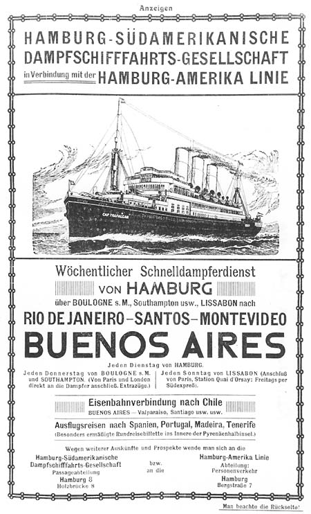To serve the Brazilian Rio Grande coast, three 4,500-ton steamers commenced operation in 1905. Mainly provided for emigrant transport, appointments for 50 First Class passengers were arranged. On the River Plate route were further added the 11,500-ton steamers of the "Bahia" - class, conveying up to 2,500 emigrants and 200 passengers in the First Class. From 1910 the common schedule of the Hamburg-Sued and the Hapag offered weekly departures from Hamburg as well to Rio as to the River Plate, which remained unrivalled until being discontinued by World War I.