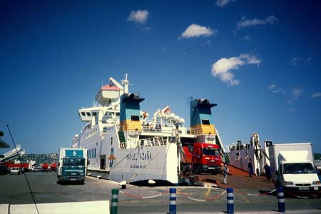 After WWII migrant workers on their voyage from France to their families used the train to Algeciras and from there the ferry to Morocco. Car ferries of Bland Line Isnasa, Limadet and Trasmediterranea as well as Transtour hydrofoils replaced steamers. The attempt by Klosters Sunward Ferries with the "Sunward" in 1966 on a Southampton - Vigo - Gibraltar - Casablanca route failed when Spain closed its ports for tourist ships calling at Gibraltar. From 1971 for a few years the car ferry "Eagle" (11,609 gt) of Southern Ferries Ltd (P&O) was employed on Southampton - Tangiers services, in 1975 sold to Nouvelle Cie. de Paquebots as "Azur" and in 2004 she became the "Royal Iris", cruising for Mano Maritime of Israel.