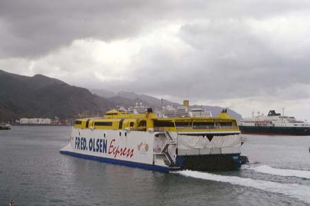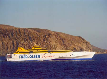 Lineas Fred. Olsen started catamaran hi-speed operations, first with the 96m InCat "Bonanza Express". The Austal trimaran "Benchijigua Express" for 1,350 passengers and 340 cars surpassed the other hi-speeds in size. The white/ yellow catamarans were labeled FRED. OLSEN EXPRESS. Trasarmas hi-speeds disappeared from the timetable.