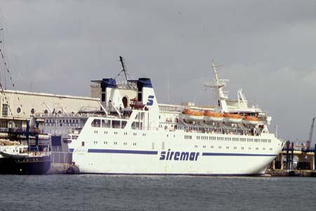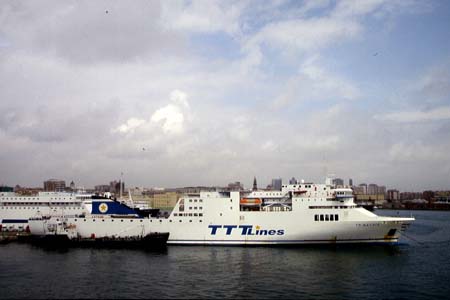 That country, initially an Italian colony, has come under British control in 1943 and became an independent kingdom in 1951. Traditionally the port of Tripoli was served by Tirrenia. In the 50s the timetable listed their steamer "Argentina" (5,014 gt) on a Naples - Tripoli route and the motor-ship "Citta di Livorno" (2,499 gt) on a Benghazi route. In 1977 the General National Maritime Transport Co. of Libya acquired two car ferries from Naviera Aznar, the "Toletela" (ex "Monte Toledo"), used on a Barcelona - Naples - Valletta - Tripoli route, and the "Garnata" (ex "Monte Granada"). Then Libya's policy under Muammar al-Gaddafi, who had come into power in 1969, caused an international boycott and all these ferry services ceased operation. In the 21st century, after al-Gaddafi had changed politics, the boycott vanished in 2004. Oil-rich Libya invested in Italy, based on the good relations with Italian prime minister Berlusconi. With the revolt of 2011 and the war for oil, the situation changed in an unforeseen way.