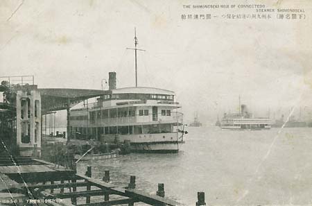 Of course the islands of Japan were always reached by boats. About the start of railway-connected ferries, W.A. Pearce reported: "The first of Japan's railway ships did sail on the fresh water of Lake Biwa, the large lake to the north of Kyoto. In the early 1880s the Government Railway's Tokaido line was being built from Tokyo to Osaka, by way of Kyoto, and by 1882 its head of construction was approaching the eastern side of Lake Biwa from the north. To connect onwards to Kyoto, in 1882 the Taiko Steamship Co. was formed, whose purpose was to run a ferry service from the small lake port of Nagahama down to Otsu, from whence connection could be made to Kyoto. For this service, two single-screw 516 ton steamers (...) began operating the Otsu-Nagahama N.R. in 1884. These two ships were built by one Kirby, who is quoted as being 'an English resident of Kobe'...". Also the first railways were built under leadership of an Englishman, chief engineer Morell. The rails reached the harbour cities of Yokohama in 1872, Kobe in 1874 and Tsuruga in 1884, initially including a Lake Biwa shipping route. In 1889 the Tokaido main line was completed and the Nagahama - Otsu shipping route became obsolete. From 1901 the Sanyo Railway Co. linked the Tokaido line with Shimonoseki on the Kammon Strait, the port of departure for Korea. Sanyo steamers connected from 1903 Shikoku island and already from 1897 Kyushu Island in the south, first with Tokuyama and from 1901 with Shimonoseki as port of departure.