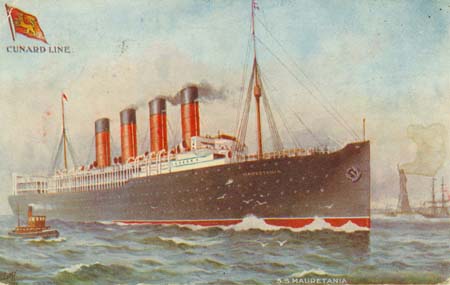 Another threat came from the other side of the Atlantic. In 1902, the American bank and railway tycoon J.P. Morgan called into being the International Mercantile Marine Company (IMM), which purchased seven great navigation companies, among them the famous British White Star Line, and was then ruling over a fleet of 133 steamers comprising about 900,000 tons. The government felt the necessity to react and to restore Great Britain's maritime prestige. It entered into a treaty with Cunard subsidizing the building of two exceptional express liners by an amount of approximately 2 1/2 million pounds sterling. The ships were expected to attain a maximum speed of 24.5 knots and being prepared for a quick conversion into an auxiliary cruiser in the case of a military conflict. As first, the "Lusitania" with a tonnage of 31,550 was completed at Clydebank by John Brown & Co. in 1906, her sister "Mauretania", measuring 31,938 tons, followed one year later from Swan, Hunter and Wigham Richardson at Liverpool. The ships were introduced on the prominent Liverpool - New York route (Cunard changed to Southampton not before 1920). They were the greatest vessels by the time and featured new standards for cabin passengers. Each won the Blue Riband, the virtual symbol for the fastest passage between Daunts Rock (Queenstown) and Sandy Hook light house (New York). After the machinery was modified and propellers of an improved design were fitted, the "Lusitania" made her fastest passage in 4 days, 11 hours and 42 minutes and the "Mauretania" did it in 4 days, 10 hours and 51 minutes, each putting up new records at 25.85 resp. 26.06 knots. Achievements like that have only been possible by the application of the new propulsion with steam turbines exerting 68,000 h.p. onto 4 screws, after the piston engine had arrived at the end of its potentiality. Shipbuilding had entered again a new era which temporarily found its outer expression in the 4 slightly inclined funnels, following the German model.