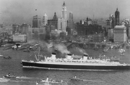 In 1929 the NDL express liner "Bremen" regained the Blue Riband for Germany, and also Italy and France were striving for the title of the fastest ship. Cunard, in conformity with the government, was anxious to react and placed an order for a super liner that should be capable to regain what had ever been Britain's. The condition for the government's subsidy was the merger of the two greatest shipping companies of the country, Cunard and White Star, which was decided in 1930. The same year the keel was laid for a 80,000 ton ship at John Brown & Co. Yard of Clydebank to outshine everything afloat. The economic crisis, together with strikes in the 1930s brought the works to a standstill. So, the imposing superliner could lay off for its maiden voyage not before 27 May 1936 from Southampton to New York, where all the great steamers docked on Manhattan's West Side piers. Divergent from Cunard's habit of giving passenger ships geographical names ending on "-ia", it was baptized to the honour of Queen Mary, though initially "Queen Victoria" had been contemplated. With a tonnage of 80,774 and dimensions of 310 by 36 metres, she surpassed the largest liners of the time by about 50 percent. Her geared turbines and 4 screws were standard for the prestigious liners of that time. In August 1936 she run in 4 days, 23 hours and 2 minutes from Cherbourg to New York and covered the traditional racing route between Bishop Rock and Ambrose Lightship within 4 days, 8 hours, 27 minutes at a speed of 30.14 knots fetching back the Blue Riband from the French rival "Normandie". In August 1938 she bettered her record on to 30.99 knots.
