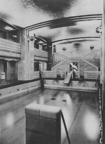 The public space of the "Queen Mary" represented the 'glitz and glamour' of the thirties, though it was not quite as sumptuous as the interiors of the rivaling "Normandie". Vernon Gibbs commented: "The Cunarder, although still a luxury ship, was fitted out on a more strictly commercial basis to ensure a full passenger complement..." Three quarters of a century later, a wonderful lady from Greece, the poetess Eleni Fourtouni, related her impressions of a voyage to New York in 1953 aboard the "Queen Mary": Having taken a steamer from Piraeus to Brindisi, a train to Paris and another one to Cherbourg, she embarked there on the 'Queen'. Service and amenities were excellent, the cuisine however "very British", but she, then an 18-years-old girl, enjoyed the orchestra, the live music and dancing...