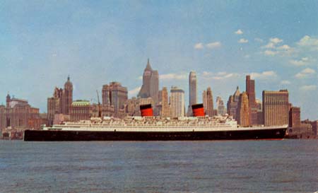 The "Queen Elizabeth" was the first liner being refurbished for peace time duties. With a delay of seven years she went on 16 October 1946 on her initial voyage from Southampton to New York. Among the 2,228 passengers there was an illustrious assembly of prominence from politics, industry, media and entertainment. Most attention however attracted the presence of the Soviet delegates of the United Nations, Mr. Vishinskiy and Mr. Molotov. The passage took 4 days, 16 hours and 18 minutes. The New Yorkers met the ship a friendly reception with a lot of vessels and circulating planes. "No attempt has been made to run the "Queen Elizabeth" 'all out' across the Atlantic. Her shortest passage, 4 days, 5 hours, 3 minutes (29.77 knots), accomplished in 1954, included a best day's steaming of 710 miles (30.87)", reported Vernon Gibbs. In the 50s she was equipped with Denny-Brown stabilizing fins.