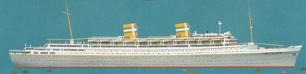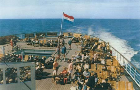 After the war, operations to New York were resumed in 1946 with the "Noordam" (10,726 ts), one of a quartet of diesel-powered passenger-cargo ships of the '30s. HAL was fully back among the prestige lines when the beautiful "Nieuw Amsterdam" docked at New York, New Jersey pier, in 1947. A fleet of modest passenger-cargo ships was built in the years to follow. New passenger liners were the "Ryndam" (1951/15,015 gt) and the "Maasdam" (1952/15,511 gt), economic single-screw steamers for a traveling speed of 16.5 knots. The "Statendam" (1957/24,294 gt) was a little faster. The new flagship was completed at Rotterdam in 1959, christened by Queen Juliana on the name "Rotterdam" - an innovative twin-screw turbine steamer of 38,645 tons, marked by two 'smoking masts' instead of a conventional funnel, painted white with a grey hull. Prominent passenger on her maiden voyage from Rotterdam to New York was Princesse Beatrix of the Netherlands, dancing every evening in the ship's Cafe de la Paix nightclub, as the press reported.