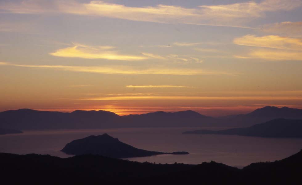 The course is towards the Cyclades. After another hour the first island comes into view on port side in the distance, then a second and a third one, mountainous and arid. Somewhere white houses are scattered. Maybe it’s Serifos (decades ago we enjoyed our honeymoon there, and King Constantine arrived aboard a destroyer, by chance of course). After a traveling time of three hours, the sun dips in the horizon. A mountain on an island in the west rises its top like a pyramid, while in the east other remote islands are passing by. Who may know all their names? It’s getting dark.