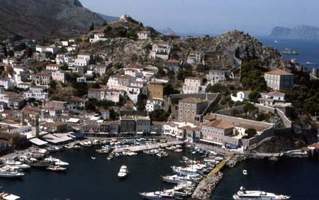 You may approach Aegina also from the south, after a visit to Hydra, the island which consists entirely of rocky mountains overtopping a tiny old town. A flag is flying on a rock, deep below are the small stone houses and the narrow roads, consisting of stairs, where donkeys are the means of transport. And donkeys are waiting on the quay, where yachts and hi-speeds, the “Flying Dolphins” are mooring. During that summer in the late 90s a car-ferry of Hellenic Seaways, arriving from Piraeus or, on the return trip, from lovely Spetse Island, enters the narrow harbour basin of Hydra, though no motorcars are unloaded. They have no access to Hydra, neither to Spetse Island, and then this ferry route disappeared.