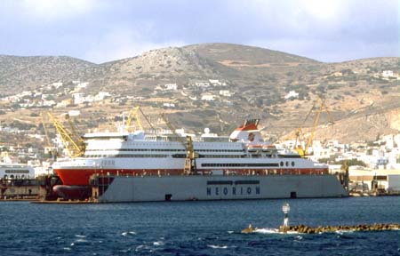 Performing a skilful manoeuvre, the ship docks with the stern on the quay, ready for the unloading and loading business (bow thrusters have made the proceedings much easier, while earlier the anchor had to be used). The red “Superfast XII” is lying in the dry-dock of the one-and-a-half century old Neorion Yard in the harbour basin (years ago, the Greek say, even Soviet warships had been repaired here). In the narrow streets, passing by the palatial town hall, built under the reign of King Otto by his Bavarian architect Ziller, the visitor gets to the numerous churches and chapels. In one of them he can admire an early painting of El Greco, missed for centuries and just recently identified. Before he may climb up the steps to the Metropolitan Church, he should pay a visit to the theatre, not really an imitation of the Scala of Milan, as it is exaggeratedly said, but nevertheless astonishing for this remote place. And who then even discovers the sign of the Austrian consulate, may feel to have stepped back into the age of the Habsburg dynasty, when the steamers of the Austrian Lloyd had called at Syros.
