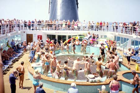 After departure in the evening, the course is almost exactly in northern direction. The next morning a “Crossing the Equator Ceremony” takes place on the pool deck, for “King Neptune punishes those who will cross the Equator without His permission”. And passengers were warned: “Pay attention to your cameras, they will get wet”. Indeed, the warning was justified, for the ceremony and the procession along and inside the pool is going to be messy, wet and crazy, a truly ‘Italian’ Equator Ceremony.
