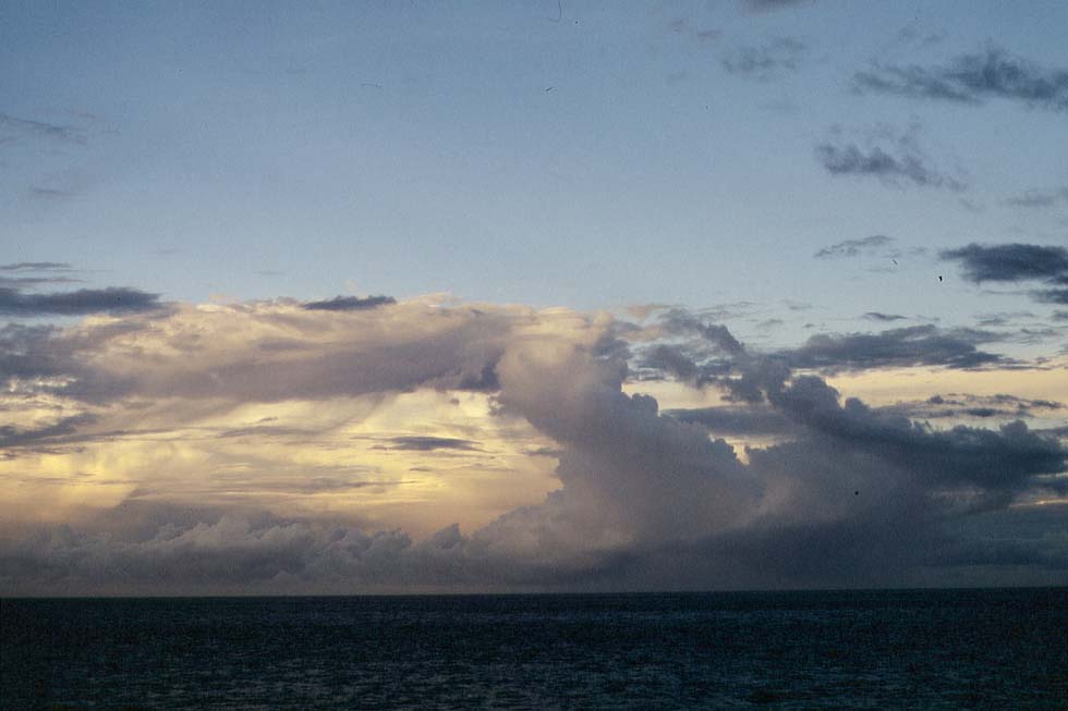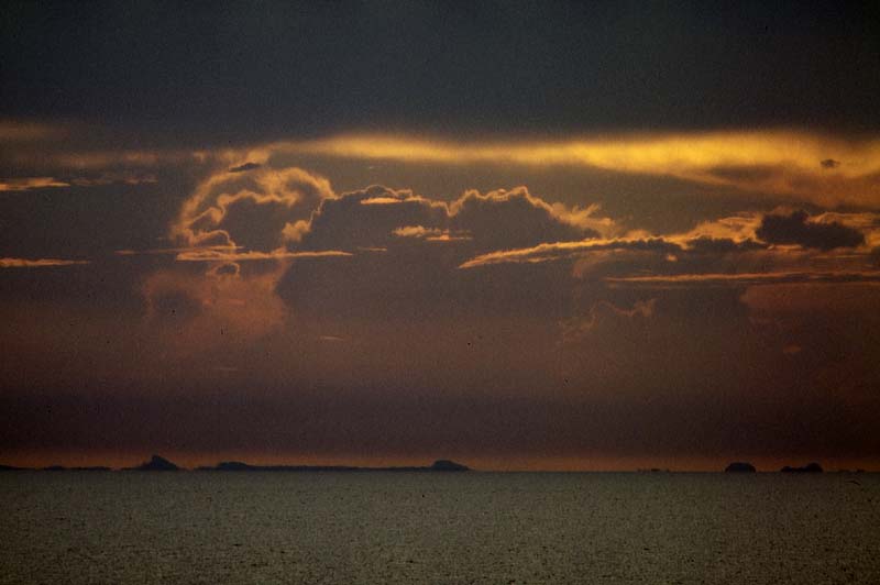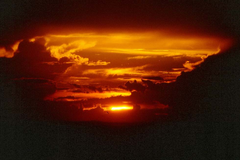 4th day: the sea is calm and blue. In the west, far away, a coast can be seen, the northern part of Mozambique. What seems to be Madagascar at the other side is only a Fatah Morgana. The calm sea without any wind would not be a good place for sailing ships “We were lying off Madagascar…”, who doesn’t remember that old shanty? In the evening the coast comes once again into view, bizarre pyramids are rising their top. Could it be Cabo Delgado? The sun has hidden behind dark clouds. But suddenly, like the scenario of a gigantic theatre, the clouds are opening exactly on the right point, presenting the most pompous African sunset ever seen.