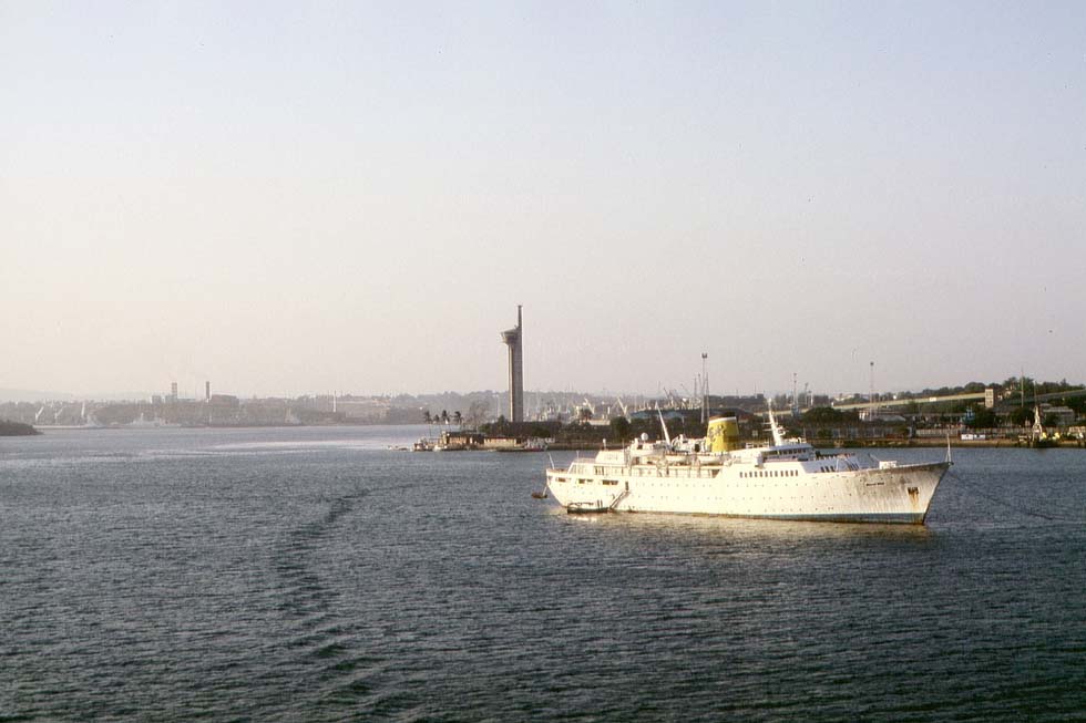 The other day embarking on the Italian “MSC Rhapsody” at the terminal proves stressing like every embarkation, though the 17,000-ton vessel is laid out for only c.800 passengers, not even 600 had booked and among them 60 have cancelled in the last moment, obviously for fear of the Somali pirates during this March of 2009. On the quay the names of other ships are painted, most striking the letters QE2. Also Swan Hellenic is represented, a tiny British company, which never owned more than one ship – and an aged gentleman tells he had traveled on their old “Minerva”, 99 percent of her passengers being British. On board the “MSC Rhapsody,” apart from English, much German can be heard, also Afrikaans, the language of the Boers, French, Italian and some Spanish. The interior of the ship is cozy, even the showroom comprises only one deck, and in the cabin a painting is marked “commissioned exclusively for Cunard”. It reminds the history of the ship, which once was cruising for the honorable Cunard Line. The folder on board writes: “Rhapsody was originally designed for American billionaire Hugh Heffner to be the perfect ship for the Playboy magazine resort. Her keel was laid on Sept 23, 1974 and the project was completed in 1977 at the Burmeister and Wain yard in Copenhagen. She was fitted at La Spezia, Italy, in the same year, and launched by Princess Grace of Monaco. Cunard purchased and renamed her Cunard Princess (her sister ship was the identical Cunard Countess). She was then chosen to be the perfect R&R ship for US troops fighting in the Desert Storm campaign; what is now the office of the Cruise Director was the Headquarter of General Schwartskopf; what is now the beauty salon was his bedroom. Totally refitted after the war, MSC purchased her in 1995 and she went to service in her new MSC livery as Rhapsody”. Historian Arnold Kludas informed: Launched as “Cunard Conquest”, she was transferred to La Spezia, where the interiors were completed, in 1976 cruising was started as “Cunard Princess” and in 1990 the ship was chartered out to the U.S. Ministry of Defense.