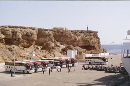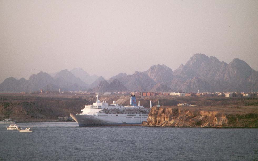 During breakfast time the “MSC Rhapsody” is already moored on the quay of the harbour bay, which had been upgraded for cruise ships and for ferries. The other vessels lying there are the “Thomson Spirit” of TUI Travel, (the former “Nieuw Amsterdam” of Holland America Line) and the tiny twin sisters “Athena” and “Artemis” of Overseas Adventure Travel. The blue waters of the bay are contrasting with the nearby steep rocks and the pyramids of the mountain ranges in the background, all this strange landscape simmering in the light-brown colour of a hostile stony desert. Only the white yachts and tourist boats in the bay are showing that Sharm el Sheikh has become an important resort of international and local tourism after a harsh time of wars: During the Suez conflict of 1967 it served as an Israeli outpost, until the Peace Treaty was concluded in 1979.