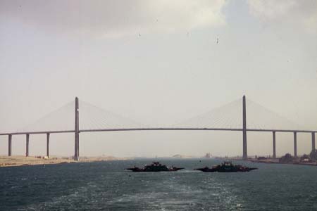 Once again united, the canal is leading toward a monument of our time, announced already by loudspeaker – the Peace Bridge, a gigantic road suspension bridge, built by the Japanese in cooperation with Egypt. In a breathtaking height of 70 metres the motorcars are crossing the canal.