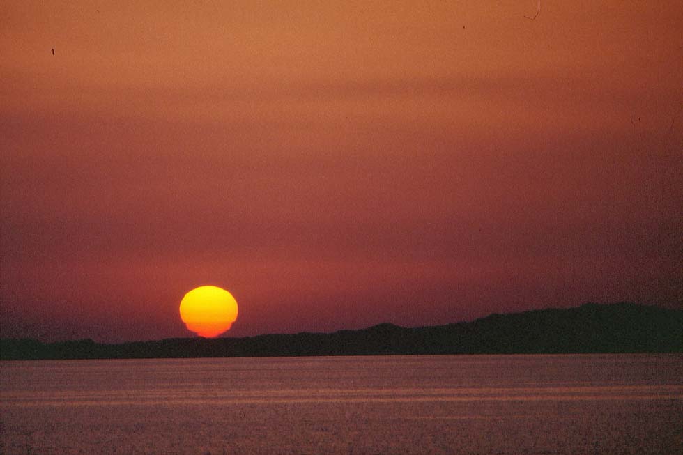 At 5 pm everybody must have boarded, the “MSC Rhapsody” moves off the quay without any tug assistance, people aboard the “Thomson Spirit” are waving a farewell and we leave the bay and the scenery of the bizarre mountain ranges, which in the centre of the peninsula are rising up to an altitude of almost 3,000 metres. That’s the place where Moses had received the Ten Commandments more than three thousand years ago. Finally the sun sets behind the last rocks near Ras Mohammed, the most southerly point of the Sinai Peninsula.