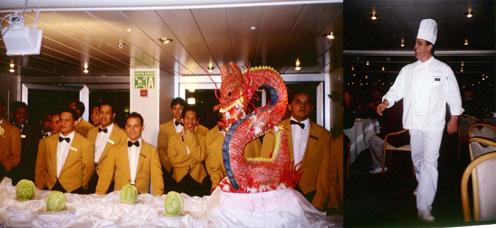 The “MSC Rhapsody” is heading northward through the Red Sea. The Bab el Mandeb Strait between Djibouti and the Yemen, separating Africa from Arabia, was passed on this Monday, the 16th of March 2009. The sea is calm and the day is sunny, though the climate is not as hot as it has been in the tropics half a week ago. On this evening a gala dinner takes place. The chef is surprising every day with exotic specialties, such as Asian, Arabian or Latin American dishes, and the guests like his cuisine.