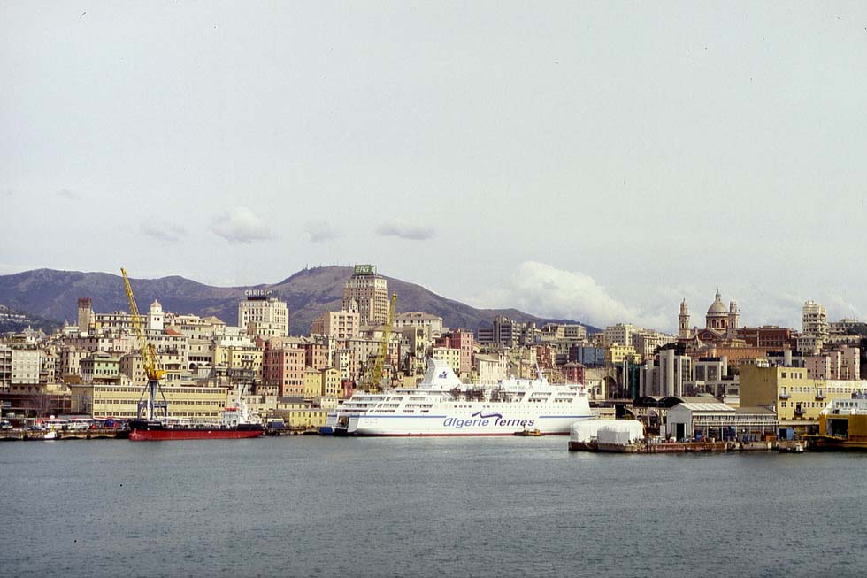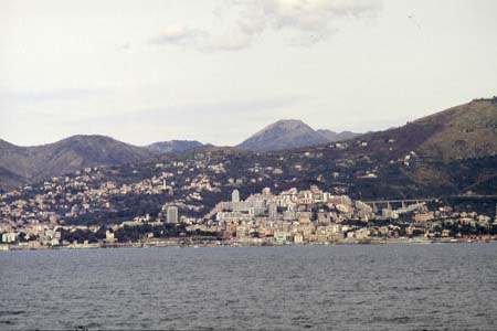 Some islands are passing by. At port, in a very far distance, a white mountain is within sight. Could it be Cape Corse of Corsica? Later the mountain range of the Appennin accompanies the ship much closer at starboard, the tops snow-white. The Alps of the Riviera are appearing in the west, covered with even more snow. What a change of climate is it since departure in South African summer, crossing the humid tropics and arriving now in European late winter… The dark-green coast of Portofino is signaling that we are not far from Genoa and indeed the city, spread over hills, can already be seen.