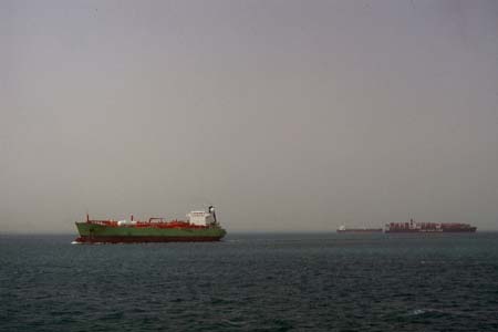 Friday, 20 March, 6 o’clock in the morning: it’s cool, sunrise had been hidden away behind clouds and the “MSC Rhapsody” is lying in the Bay of Suez, together with other vessels, around 20 or even more, mainly tankers and container ships. Pilot boats are swarming around and then the convoy enters the Suez Canal, that monument of modern history, completed in 1869. It’s an experience to cross Egypt slowly, at a speed of 8 knots, desert in the east, palm plantations and a few villages in the west. Sand dikes are framing the canal, interrupted by landing-stages for pontoons of the army in the neighbourhood of military camps. A few local ferries are crossing and somewhere there must be the only ‘undersea’ road tunnel, built in 1983. After 3 hours the turquoise-coloured water surface is widening, we enter the Little Bitter Lake and then the Great Bitter Lake. There around 20 vessels of the southbound convoy are waiting, the largest being the container ships of Maersk.