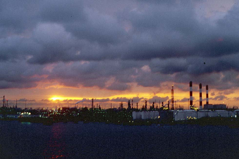 Noch ein Tag in Singapore steht auf dem Programm. Wie wär’s mit der spektakulären Marina Bay oder, ganz anders, nochmals mit der Subway zum Singapore Changi Airport, wo alle paar Minuten eine Air Asia oder eine JetStar hereinkommt oder rausgeht, die ‚low-cost’ Airlines, dazu die Langstrecken-Jets, das ist die Gegenwart, die Zukunft. Die Eisenbahn nach Malaysia wurde in Prospekten schon vergessen… 17 Uhr 45: Rettungs-Drill an Bord, dann werden die Leinen losgemacht. Ablegen, die Fahrt geht an den Hochhäusern vorüber (eine Tower-Gruppe sieht aus wie „einstürzende Neubauten“, die hätten besser nach Old Europe gepasst), dann an einem endlosen Containerhafen entlang unter einem grauen Regenhimmel auf die Ölraffinerien zu, und hinter den Schloten öffnen sich die Wolken zu einem roten Sonnenuntergang. Die Lichterketten bleiben in der Nacht zurück, es geht nordwärts auf Malaysia zu.