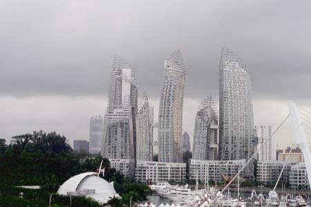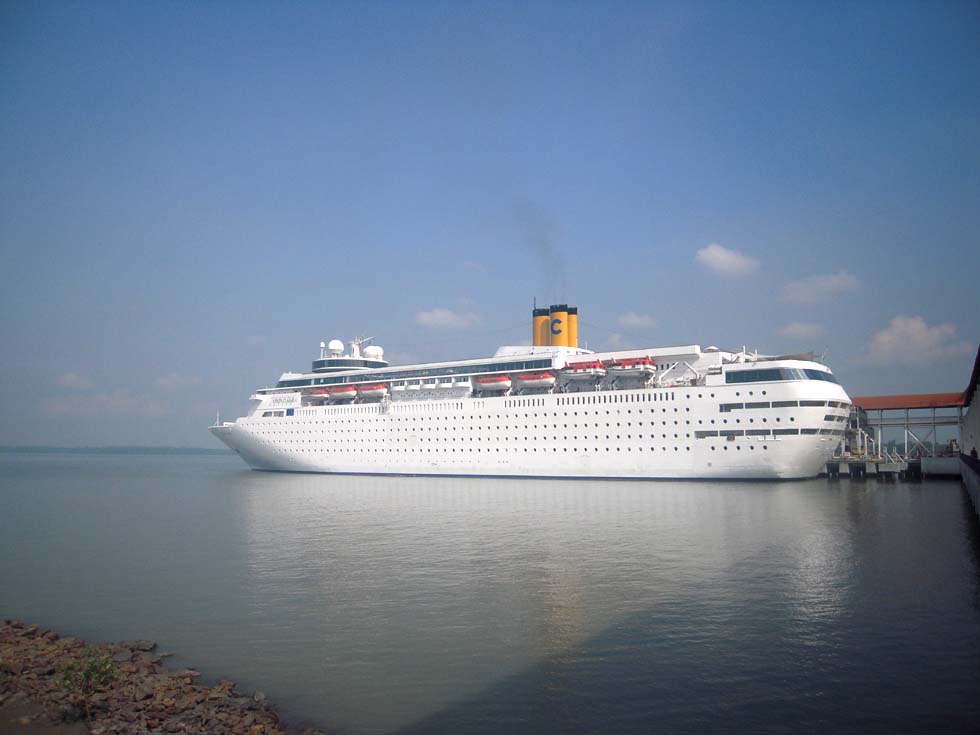 Eine Taxifahrt führt am Boarding-Tag, dem 13.April 2012, auf schnellen Strassen durch grüne Parks, zwischen neuen Hochhäusern hindurch und an einem immensen Container-Terminal vorüber zum Harbour Front Cruise & Ferry Centre – und da liegt die „Costa Classica“ am gleichen Kai wie die renovierte „Super Star Virgo“ von Star Cruises. Einchecken, boarding, der Zollbeamte fragt nach dem Herkunftsland. „Germany“ – „Danke“, antwortet er auf deutsch. – „Bravo. Aber da waren doch auch Russen“ - „Spasivo“, sagt er perfekt auf Russisch. Das 53700gt-Schiff von 1991 ist schön, saubere italienische Innenarchitektur, nicht postmodern verziert. Hinauf aufs Oberdeck! Auf einem Damm nach der nahen Insel Sentosa fährt der farbige Monorail Sentosa Express und über dem Schiff schwebt die Seilbahn dorthin. Zum späten 2. Dinner sind gerade noch zwei Plätze frei, die Tischgenossen sind Polen, „Welcome“, sie kamen per Flug via Amsterdam. Und gegen Mitternacht, am offenen Deck – nein, das kann doch nicht wahr sein – doch, es ist wahr, er ist es, unser Freund von der Kreuzfahrt vor drei Jahren an der Piratenküste von Afrika entlang. Er kreuzte inzwischen mit der Holland America Line sogar den Amazonas aufwärts – wie klein ist manchmal die Welt…
