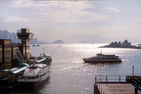 Situated close to the Ocean Terminal is the China Ferry Terminal, where hi-speed catamarans are coming and going. One of First Ferry is taking us on a trip to Macau - not before having passed the passport control, for Macau has an autonomy status like Hong Kong, too. The Austal catamaran is filled with bus seats, well occupied, and after departure the nearby skyscrapers of Kowloon are quickly left behind. The speed is rising, waves are splashing, freighters lay in the distance and other hi-speed catamarans of various companies are passing by. On one of the isles behind the green coast of Lantau Island there has been built the new Hong Kong International Airport and upstream the mouth of the Pearl River could be reached Guangzhou, the former Canton, the seaport older than Hong Kong. After a little more than an hour, high-rise buildings of Macau under a grey sky are coming into view and an immense road bridge, connecting Taipa Island, where the Macau International Airport has been erected offshore.