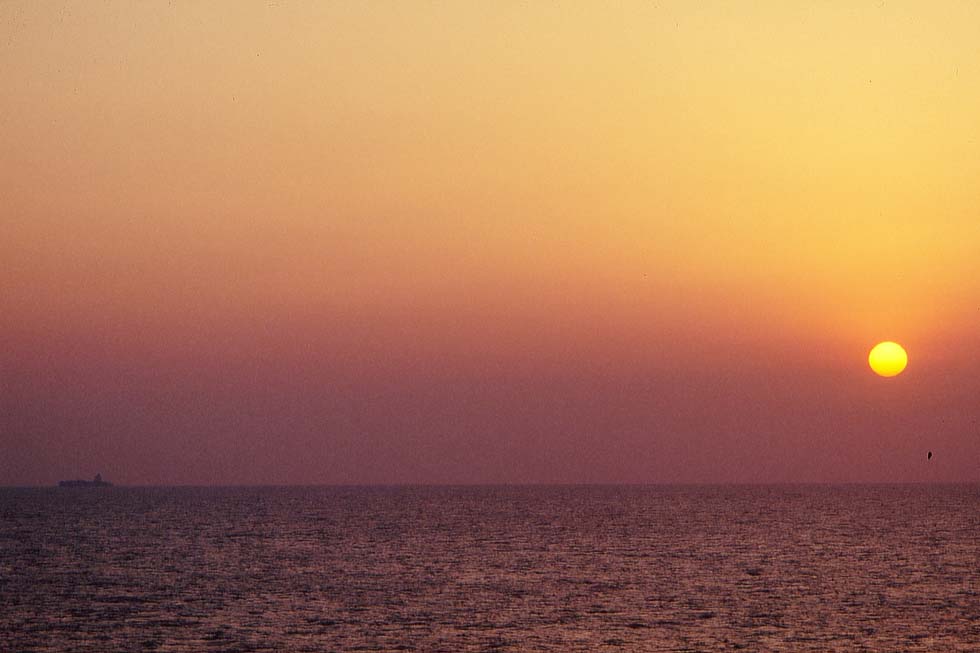 Monday is the first truly warm day, the first to enjoy the sun on the open deck. And the deck-chairs are not 'occupied' with towels like on some European ships. Our German tablemates are telling us the story of a cruise with a call to Civitavecchia, the seaport of Rome, and an audience with Pope Benedict. Some passenger asked him, how he could make his career so successfully and he answered, smiling: "I always woke up right in time and I always occupied the chairs with towels in due time." Far away another ship is accompanying us, southbound, too. And a glowing sun is setting into the light haze covering the calm sea.